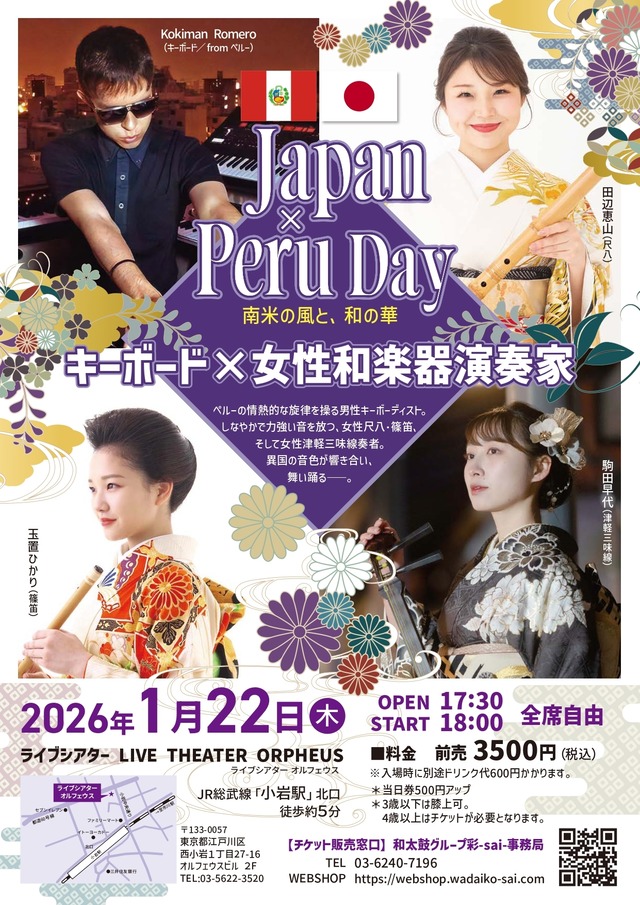 2026年1月22日(木)ライブシアターオルフェウスにて開催のイベント「Japan × Peru Day キーボード×女性和楽器演奏家」のWebチケットとなります。 ご予約後、メールにてご案内をさせていただきます。 ※紙媒体でのチケットの郵送はございません ※本公演の和太鼓彩メンバーの出演はございません ーーーーーー 日 時 2026年1月22日(木) 開場 17:30 開演 18:00 会 場 ライブシアターオルフェウス HP https://orpheusrecords.jp/live/access/index.html 住 所 〒133-0057 東京都江戸川区西小岩1-27-16 オルフェウスビル2F チケット 各公演 全席⾃由 前売り 各 3500 円(税込) ※⼊場時に別途ドリンク代 600 円かかります。 *当⽇券 500 円アップ *3 歳以下は膝上可。4 歳以上はチケットが必要となります。 主 催 一般社団法人 音楽芸術協会