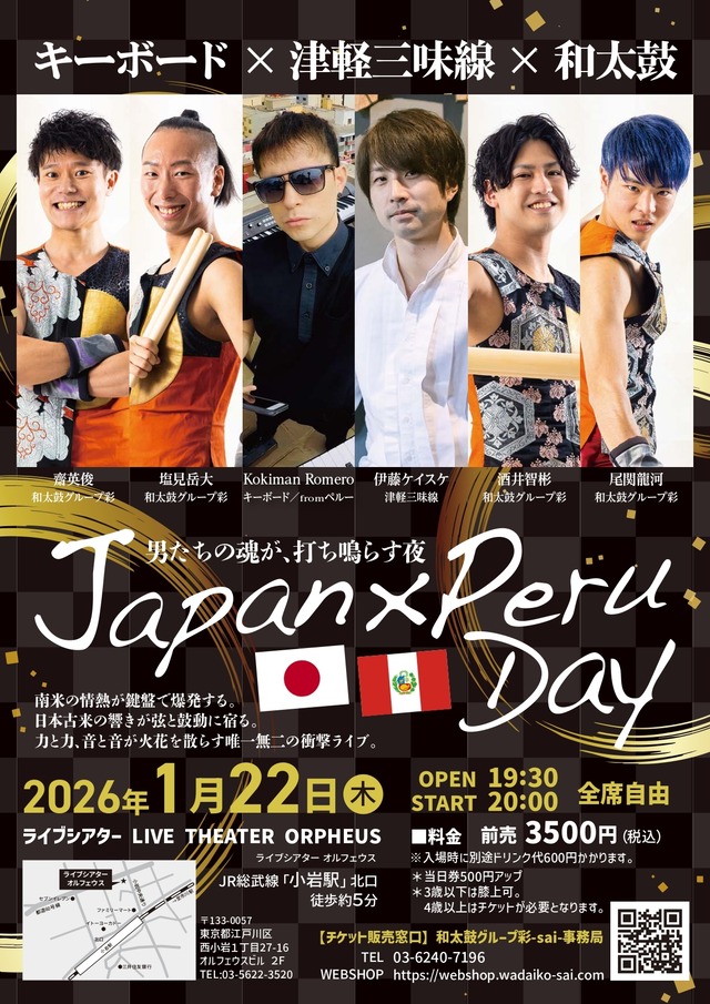 2026年1月22日(木)ライブシアターオルフェウスにて開催のイベント「Japan × Peru Day キーボード×津軽三味線×和太鼓」のWebチケットとなります。 ご予約後、メールにてご案内をさせていただきます。 ※紙媒体でのチケットの郵送はございません ーーーーーー 日 時 2026年1月22日(木) 開場 19:30 開演 20:00 会 場 ライブシアターオルフェウス HP https://orpheusrecords.jp/live/access/index.html 住 所 〒133-0057 東京都江戸川区西小岩1-27-16 オルフェウスビル2F チケット 各公演 全席⾃由 前売り 各 3500 円(税込) ※⼊場時に別途ドリンク代 600 円かかります。 *当⽇券 500 円アップ *3 歳以下は膝上可。4 歳以上はチケットが必要となります。 主 催 一般社団法人 音楽芸術協会